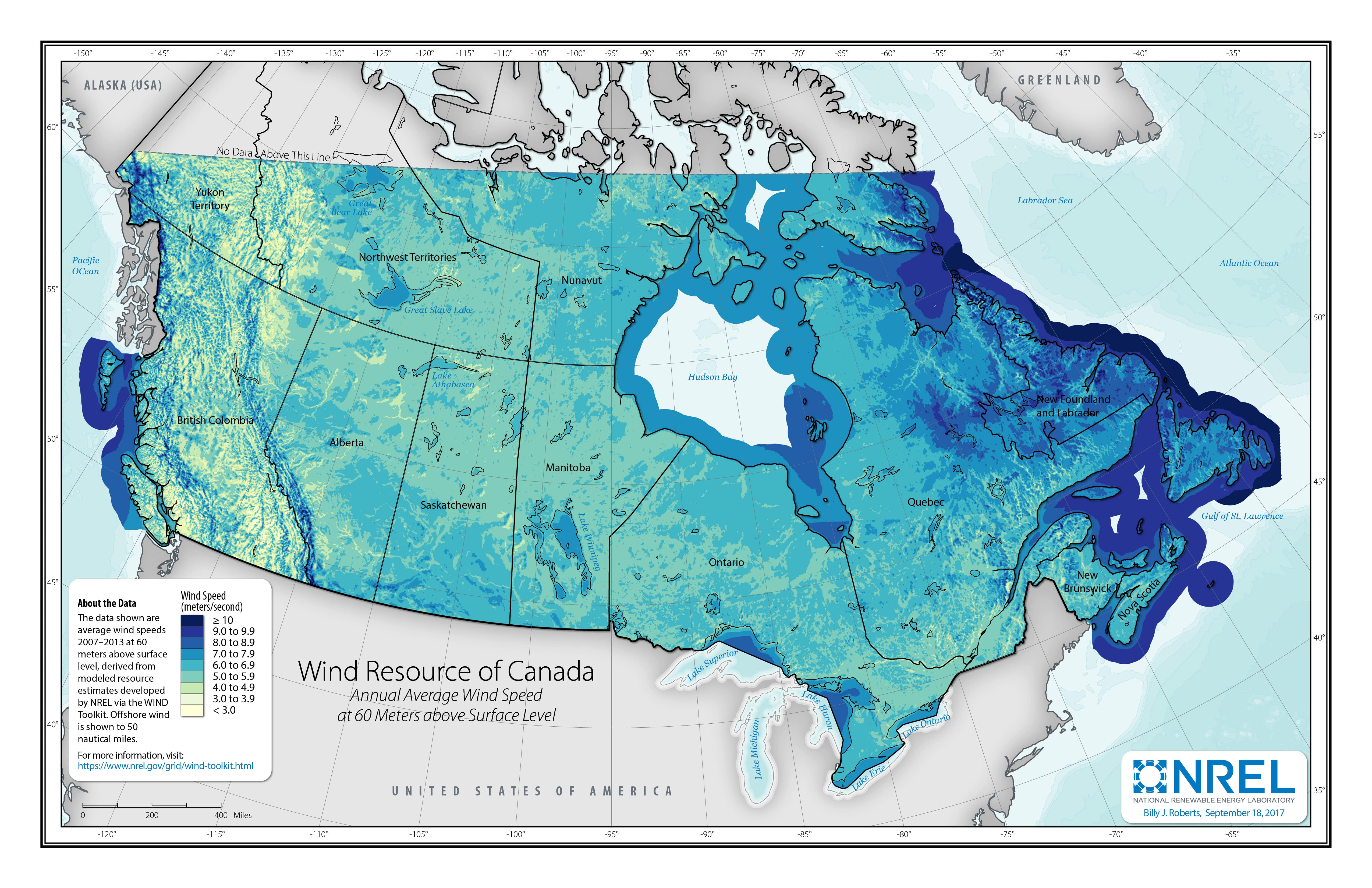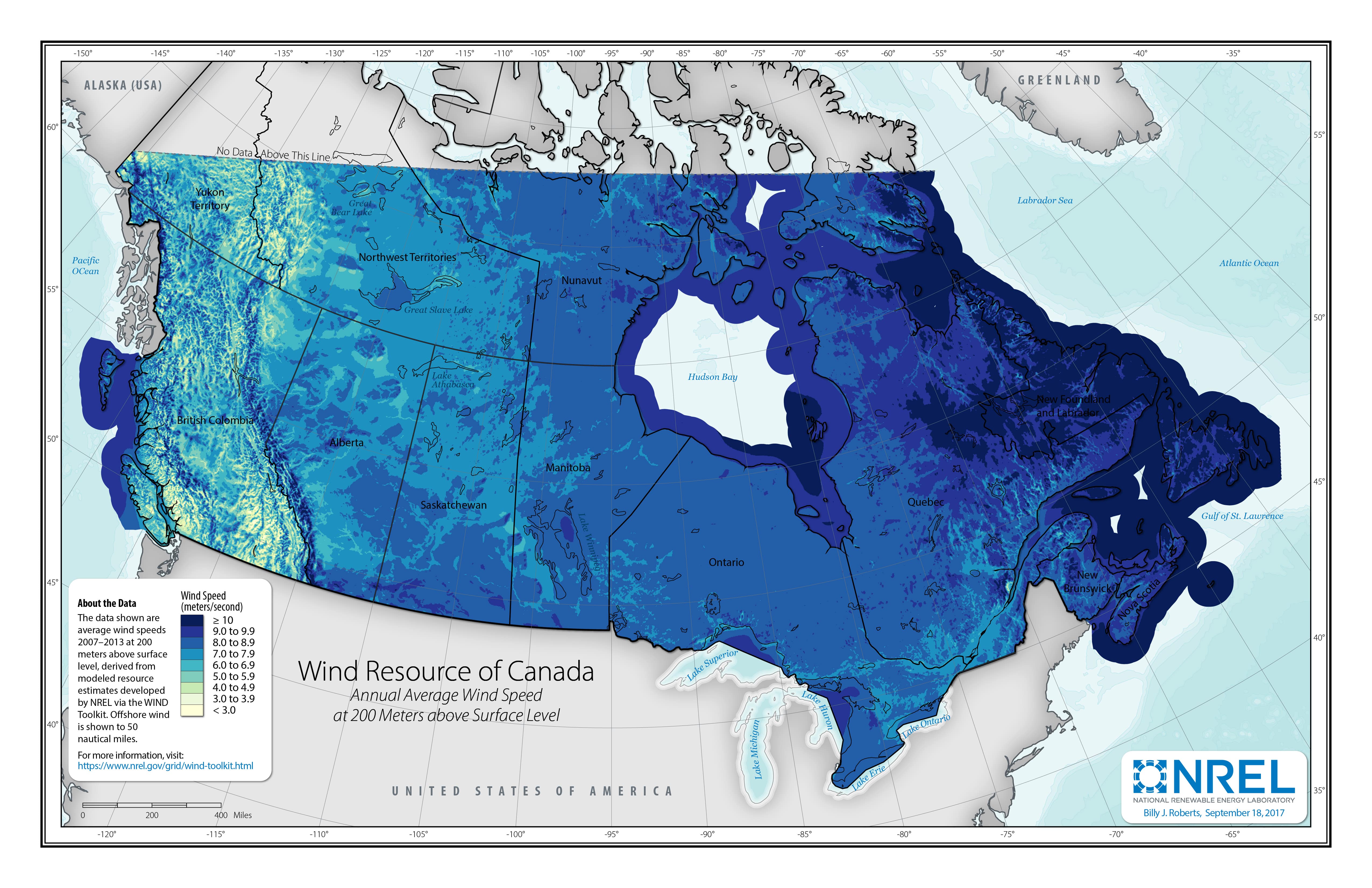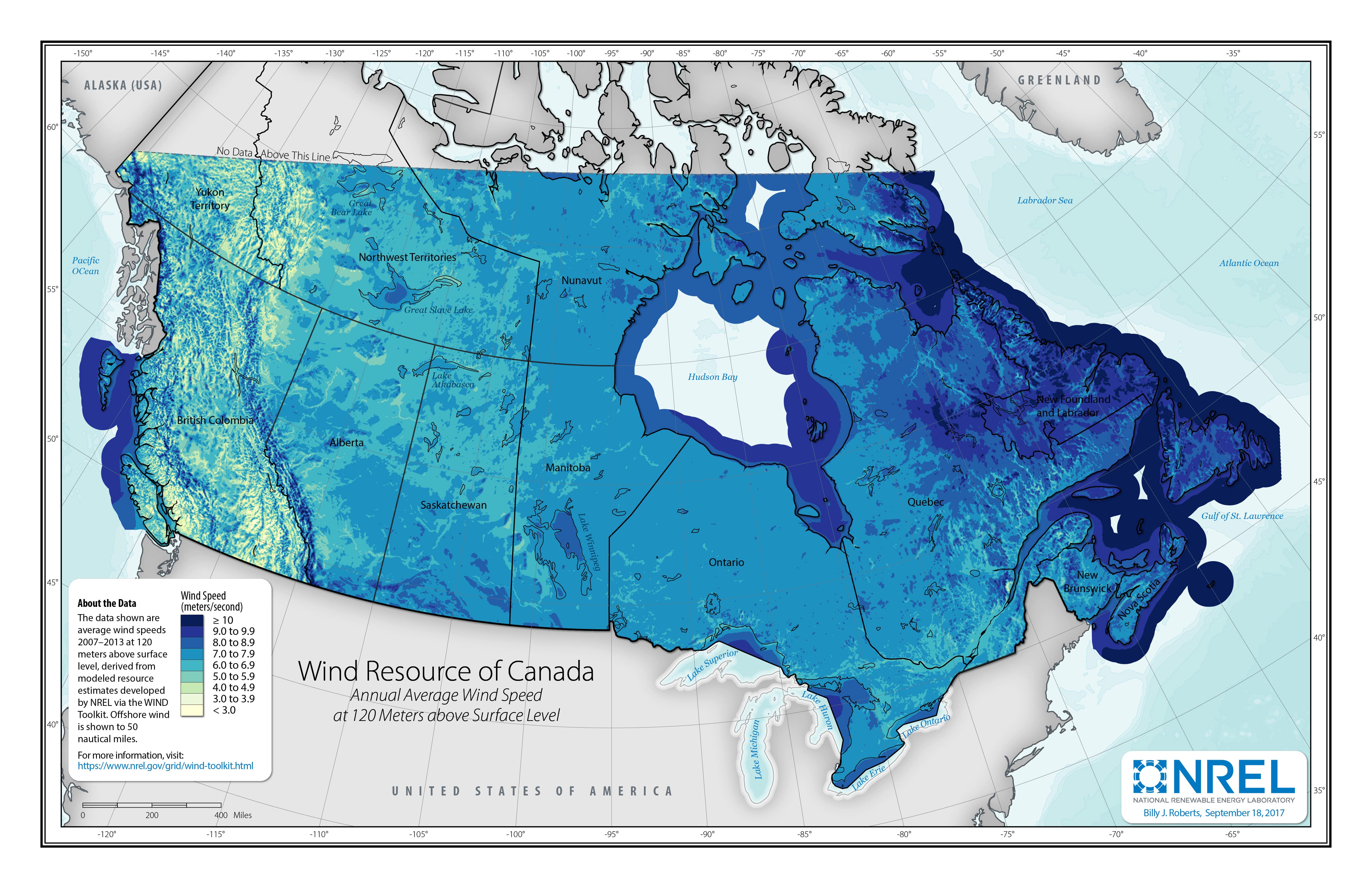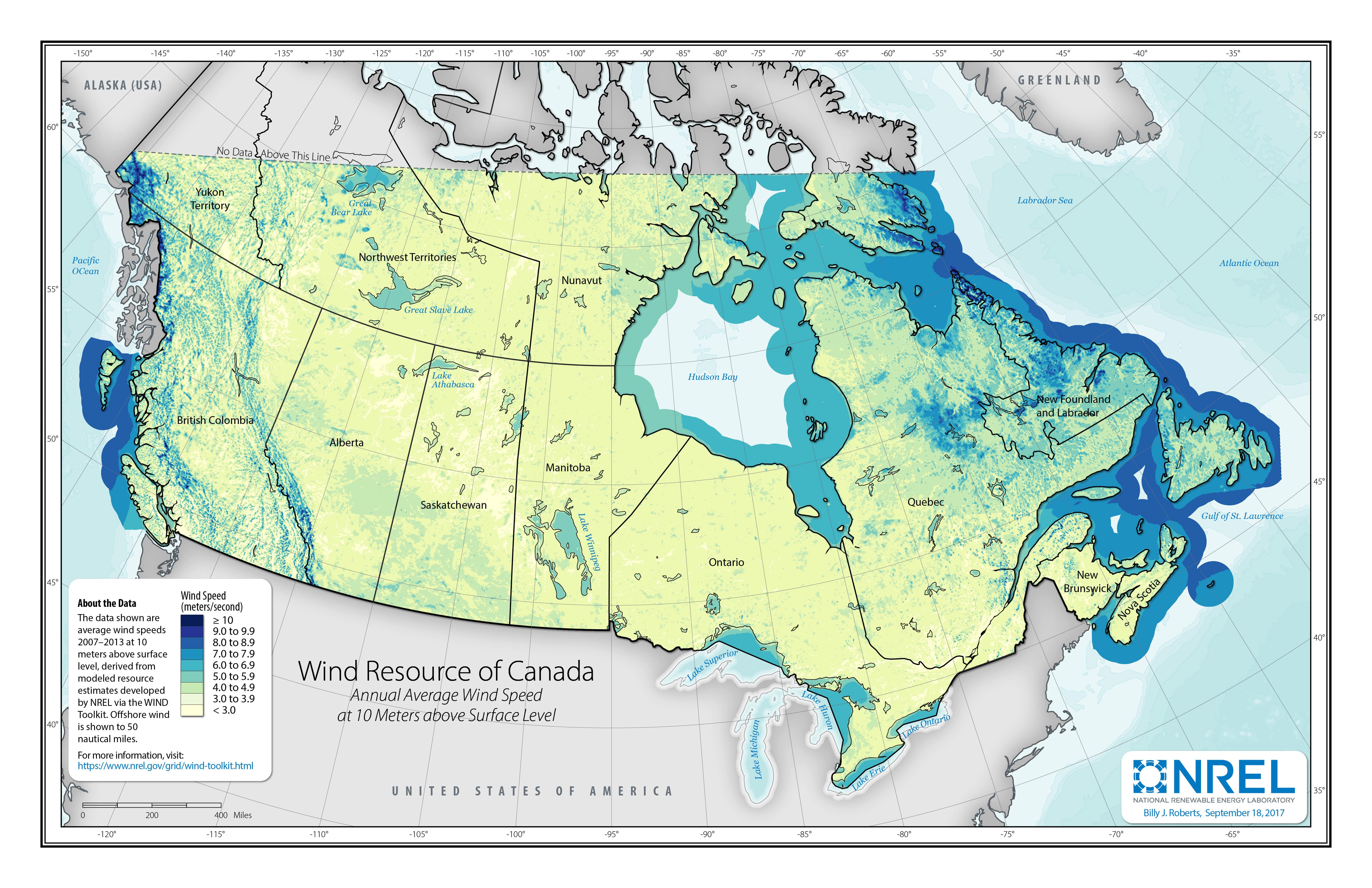 To make the maps above, multiyear average wind speeds were calculated from the WIND Toolkit. The contiguous United States, Canada, and Mexico are separate analysis regions and were thus calculated individually. These derived data sets are provided below as geospatial rasters.