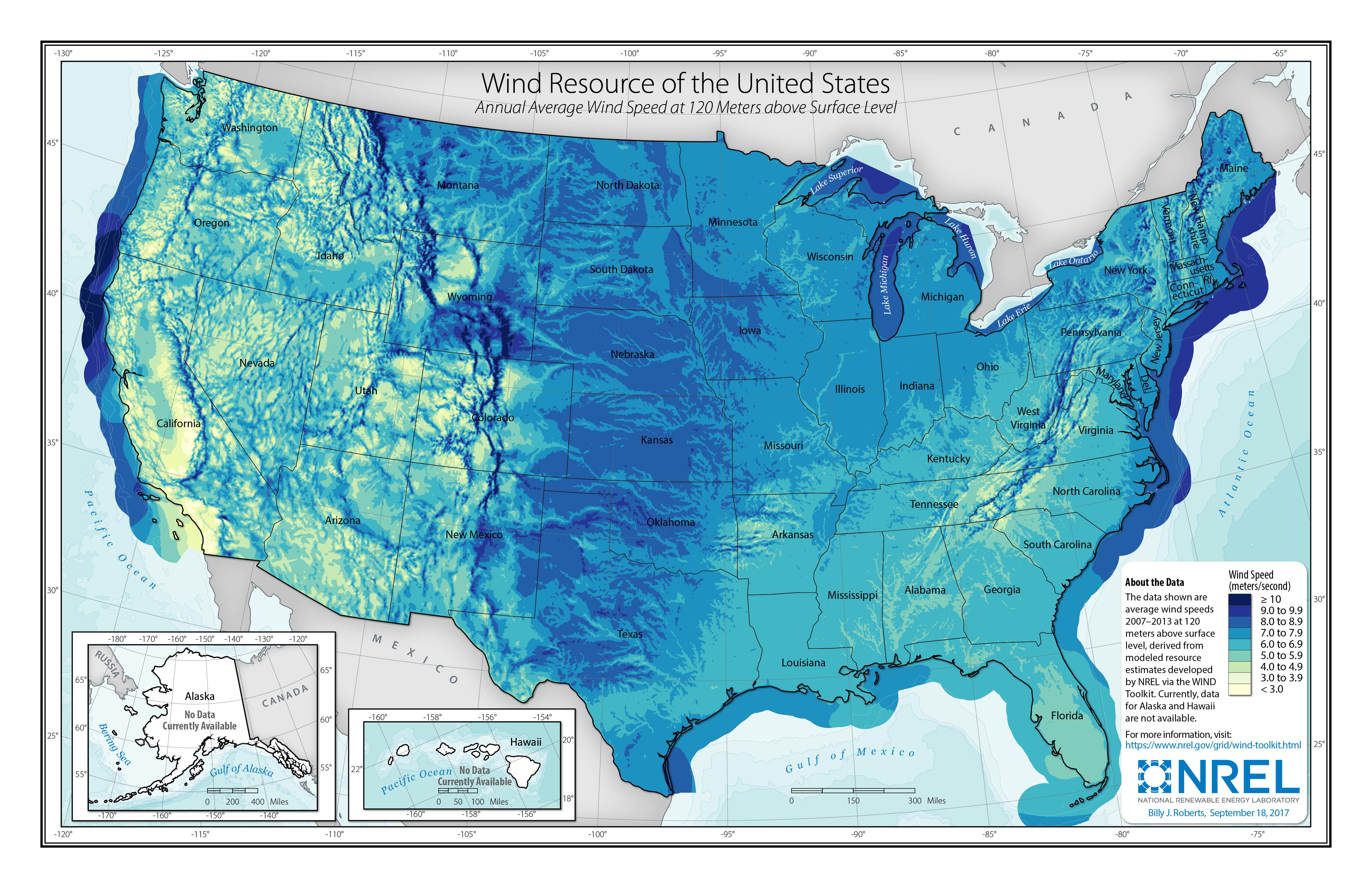 These static maps illustrate multiyear average wind speeds at various heights derived from NREL's WIND Toolkit. They may be used in electronic and printed publications with proper citation.